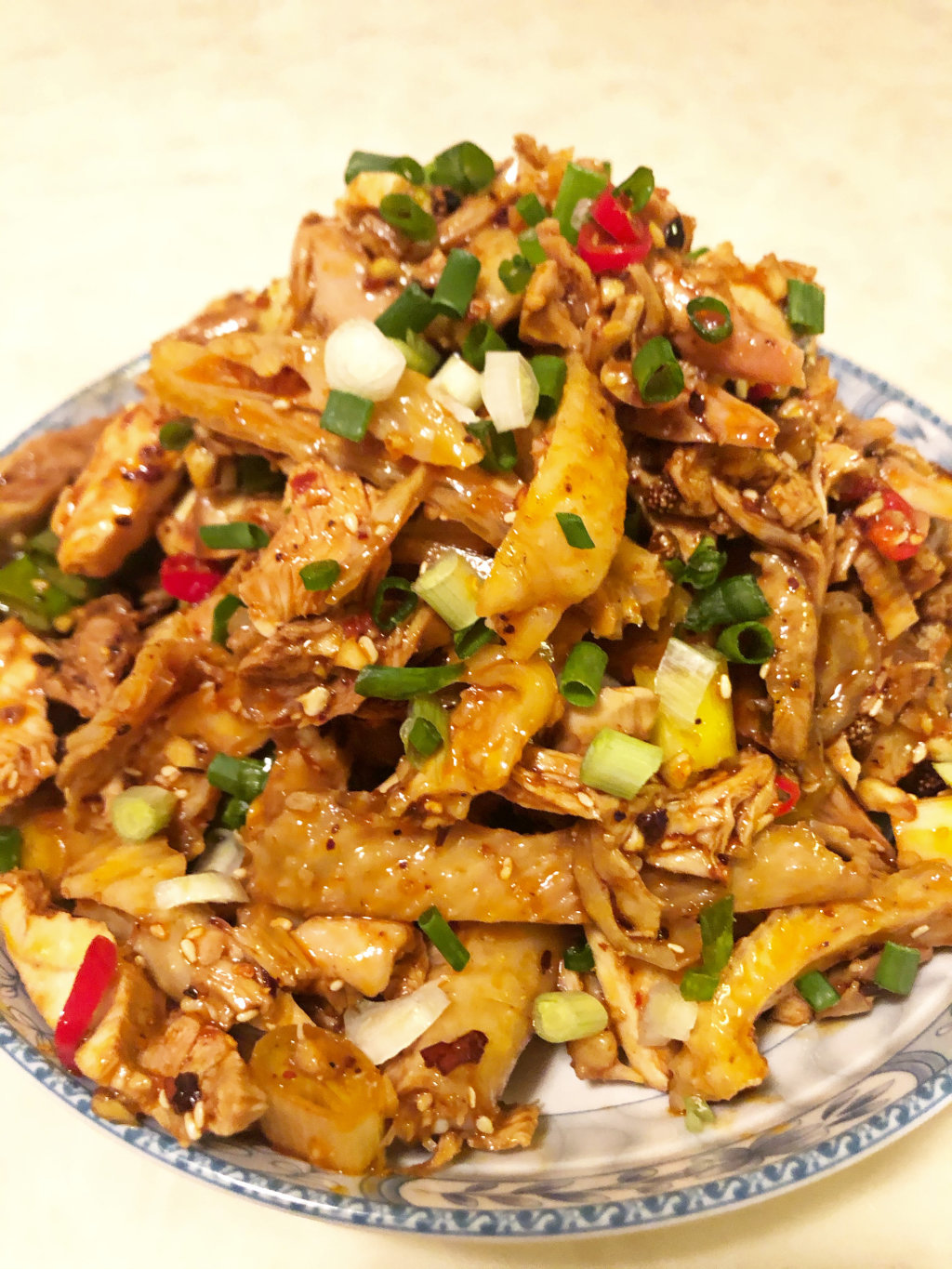 做凉拌鸡,土鸡最好,味道更香。切块焯水、再慢火炖煮后,放进冰箱里冰几分钟,鸡皮会更加酥脆。“辣椒油是凉拌鸡的灵魂。”朱程说,通常他会买一半辣的、一半不辣的辣椒面混在一起,加入白芝麻、盐、五香粉。将烧热的菜油分3次淋在上面,整个厨房都是辣椒的香味。贡菜是凉拌鸡的最佳拍档。煮过的鸡汤千万不要倒掉,烫点儿豌豆尖 ,一道搭配凉拌鸡的鲜美鸡汤就可以上桌了。