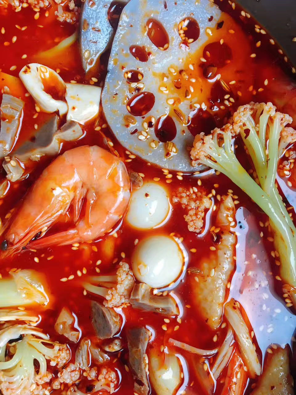 土鸡慢炖后选取清澈的鸡汤调味,注入二荆条和各类香料爆炒的红油,形成底汤。牛肉、鸭肠、鸡胗和各种新鲜时蔬,切成小块依次串在竹签上,浸泡大约5小时后,香辣酥麻的味道浸入食材,再装入特意买来的睡莲花盆,一道令人垂涎、摆盘讲究的钵钵鸡就完成了。