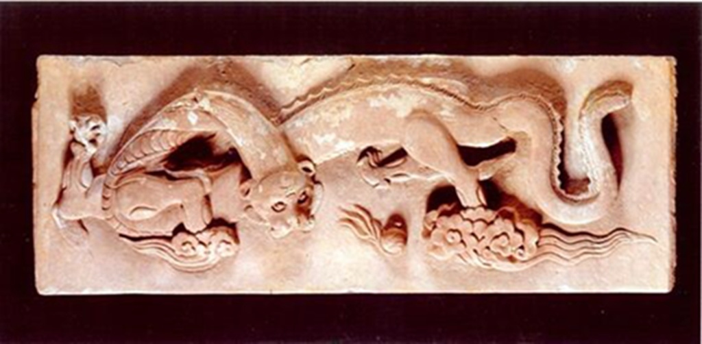 虎头回首向下,双目圆睁,专注宝珠,额上刻有“王”字。虎头头顶有长鬣向后上方飘起。虎身左侧前后足踏于祥云之上,右前足上举握一宝珠,其后足微张,肘后关节处各有一束长毛。虎背刻成鳍状,虎身细长,无斑纹,虎尾略呈S形向后摆动。