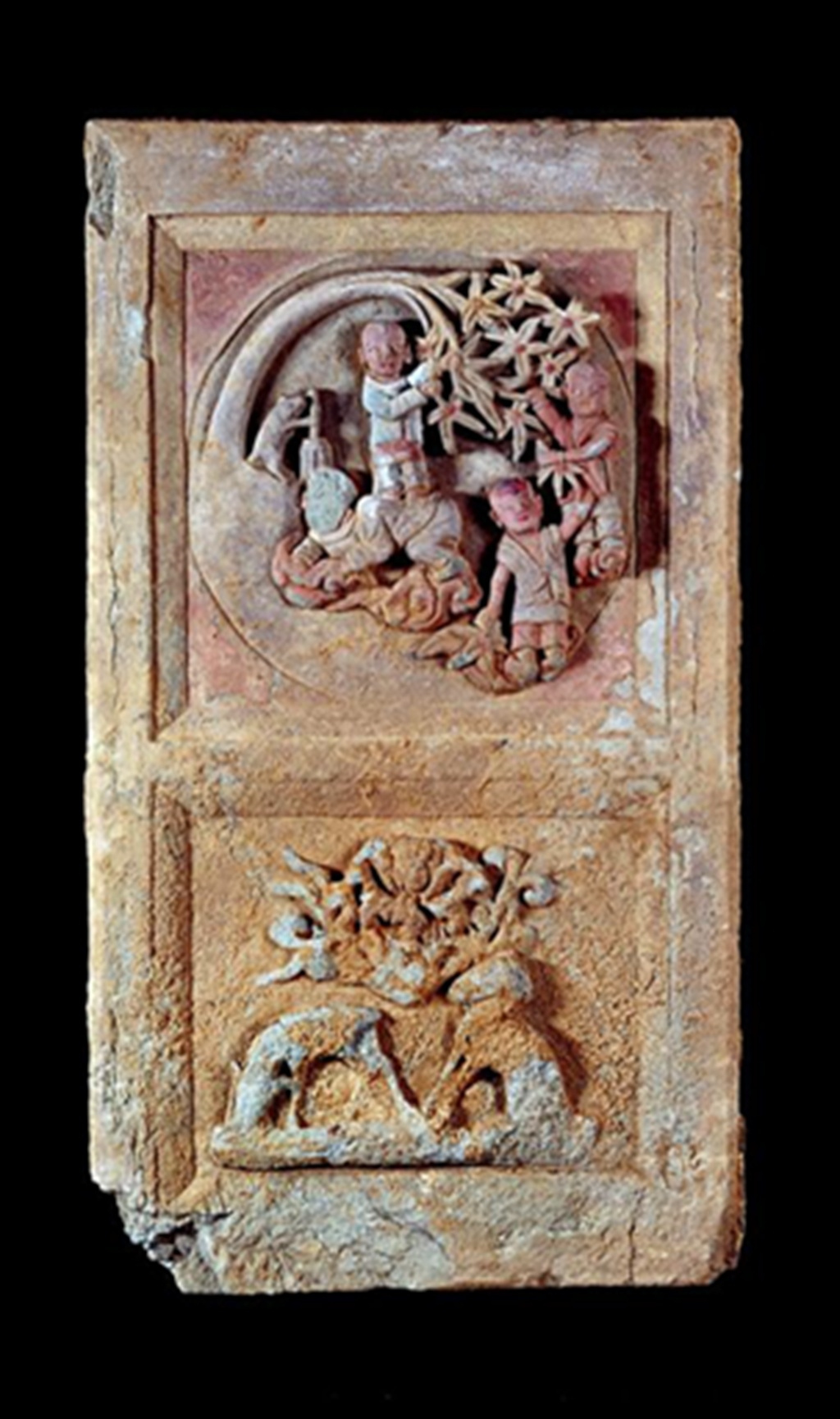 石刻正面雕刻高浮难门饰。门的分为上下两部分:上部分为正方形框,框内线刻出圆形画面,浮雕四个正在戏玩的男童。顺着圆形线框右侧边缘刻划一株小树,树下似为玉兔捣药。树枝顺着圆形框顶部下垂,两个男童手执树枝,其中一男童双脚踩在另一男童背上,被踩的男童则匍匐在云朵之上;左侧男童左手持树叶,右手执树枝,双脚踩于云朵之上;左下一男童站在最前方,左手上抬伸向左上方,右手下垂执树叶。石刻下端长方形框内雕刻一朵牡丹花,花下浮雕两只小鹿,一只鹿正低头吃草,另一只呈半蹲状,其尾部和后足部分残损。该石刻表面局部残留有红、白两种颜料。