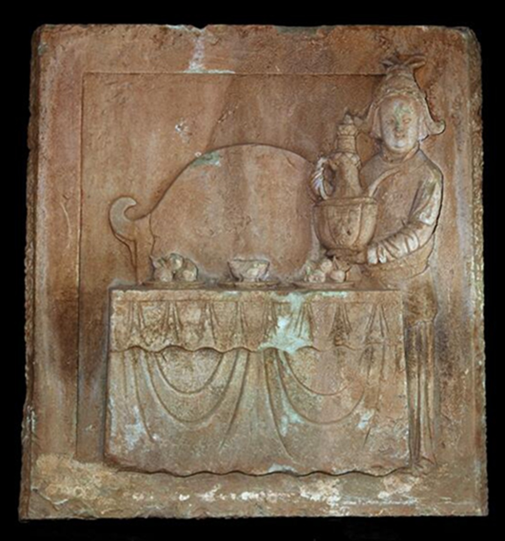 石刻正面高浮雕一桌一椅,女侍手执注子站立于桌椅旁。女侍头戴软脚花冠,面部丰满,身穿圆领窄袖长糯和长裙,束腰革带。圆领内露出内衣衣领,右手略上抬紧握注子把手,左手托住注碗。长方桌桌面铺巾,上面摆有果盘和温碗。椅子位于桌后,约与桌子等宽,仅见椅背,椅背上沿呈圆弧形。