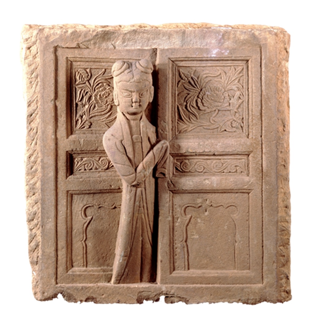石刻正面雕刻高浮雕“妇人启门”图像。石刻中的女侍头绾双螺馨,脸庞圆润,柳眉杏目,表情含蓄端庄,身穿抹胸和对襟旋袄及地长裙。女侍从一扉关闭,而另一扉微微开启的门的缝隙间露出大半个身子,向外探望。