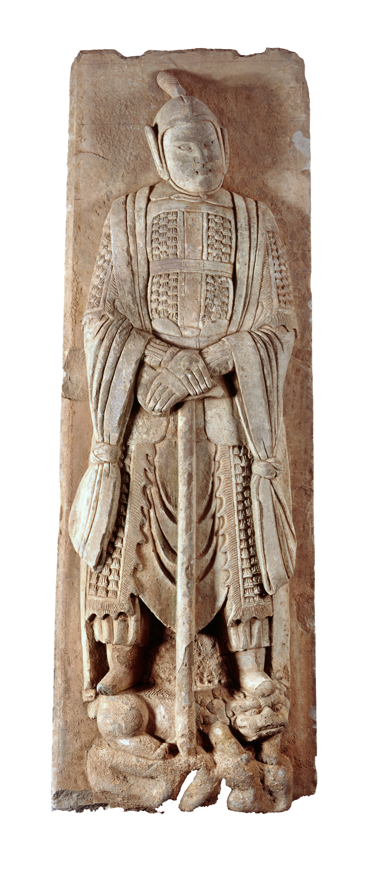 武士头戴兜鍪,鍪顶缀缨饰,两侧有护耳,鍪下沿两侧有绦带系于颏下,系带向上飘至胸前,武士双目微睁,表情严肃,略右视。身穿铠甲,着披膊,肩部披长巾。胸甲有十字形装饰,并用带约束,护腰以束带扎紧。铠甲内穿圆领战袍,右手下垂略向内弯,手握剑柄,剑锋向其左上斜伸,左手弯曲至腹前握住右手腕。甲裙裆部露出内穿的袍服,脚穿长靴,双腿张开站立于圆雕狮子造像基座上。