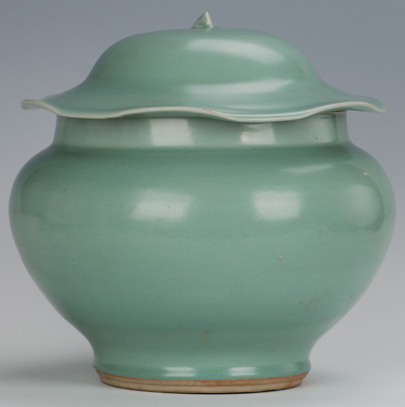 当考古人员小心翼翼清理出盖罐后,惊呆了。它首先极大,其次盖罐胎质洁白细腻,最关键外施梅子青釉,釉色柔和淡雅。盖子的边沿起伏成荷叶卷曲状,从上往下看,就像一片荷叶在随风浮动,非常漂亮。
