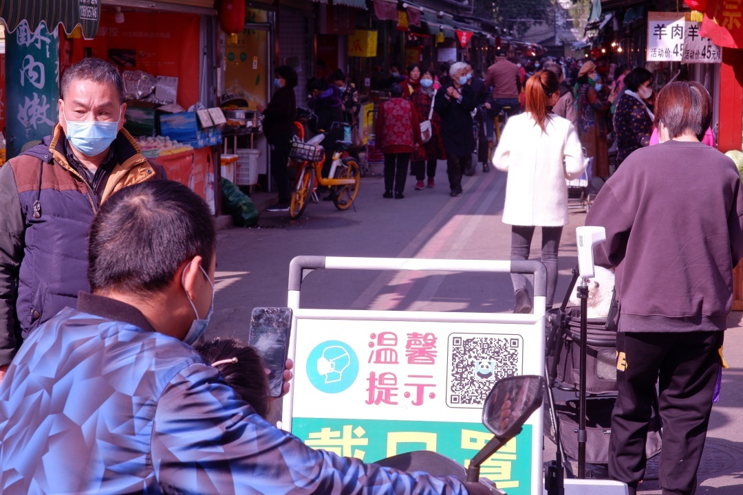 市民进入马鞍北路农贸市场都必须佩戴口罩,查验行程码和健康码,测量体温。