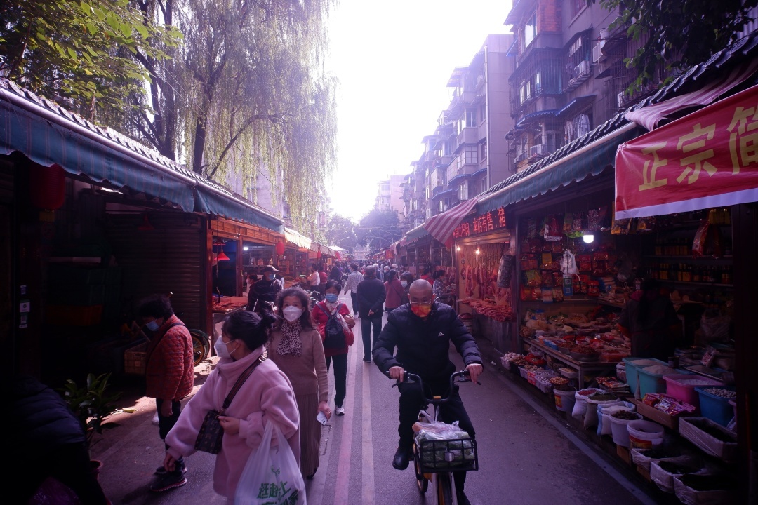 该农贸市场由马鞍北路五六条相互连接的狭窄街道组成,绵延数百米,摊位规范有序。色泽鲜艳的时鲜蔬菜、五花八门的卤味调料等,让市场的各角落充满人间烟火气。