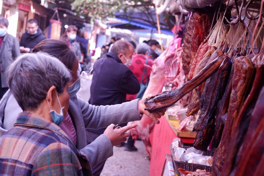 腌制的腊肉摊位前,市民认真挑选。根据品质差别和晒干程度,香肠每斤价格普遍在26元到36元之间,腊二刀肉(猪坐臀肉)价格在32元上下。