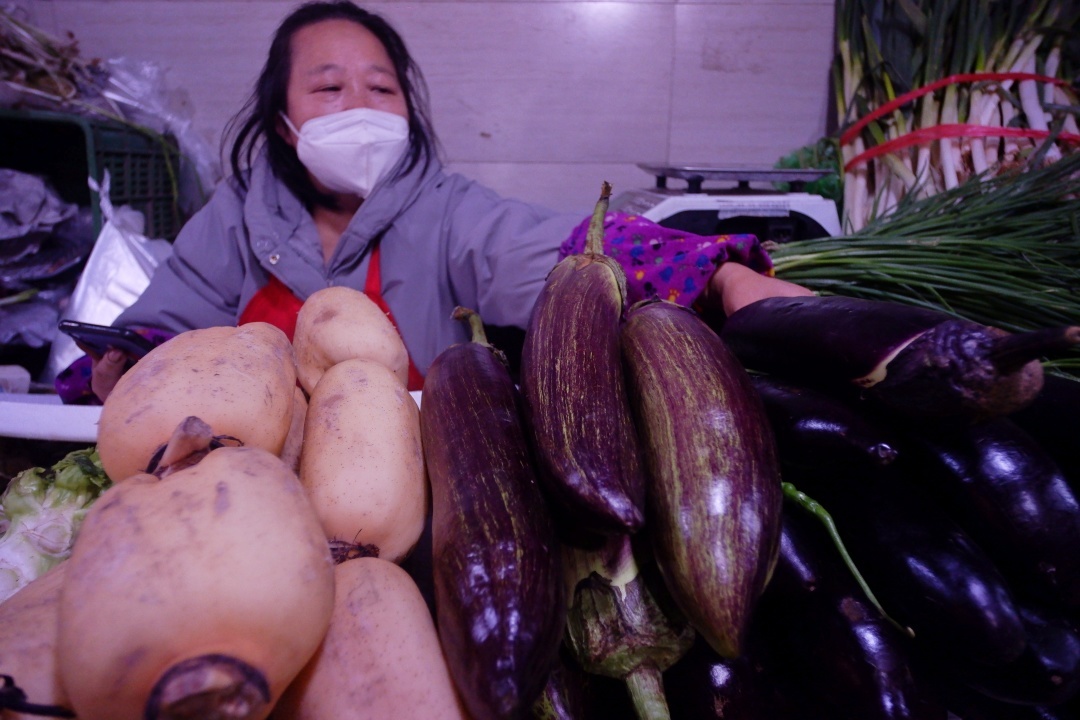 色泽鲜艳的时鲜蔬菜摊位前,商贩佩戴口罩等待顾客选购。随着当下全国菜价开始回落,成都菜市场上的豌豆尖、菠菜零售价下降约30%,但部分蔬菜价格仍居高位。在多个摊位前询问,价格普遍为茄子6元-6.5元/斤、番茄5元/斤、红甜椒10元/斤。
