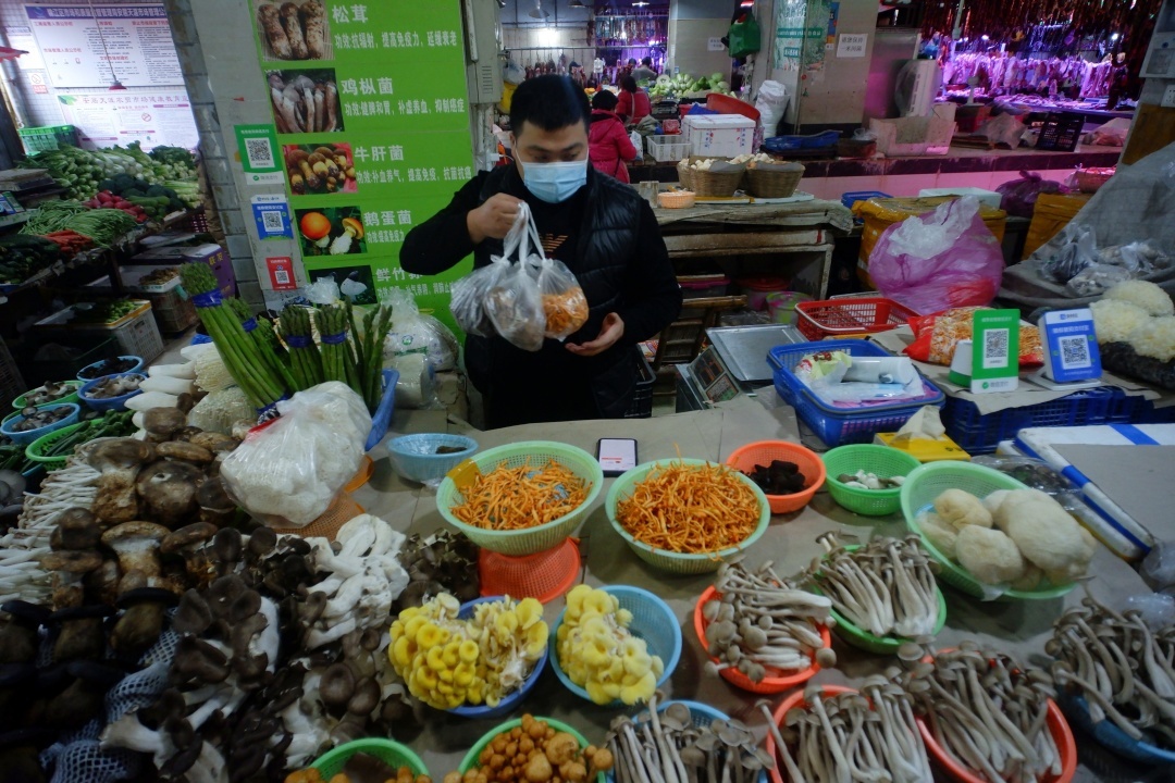 传统的农贸市场也受到“新经济”、电商配送方式的影响。“岗哥鲜菌店”老板正为在美团生鲜平台选购的顾客打包新鲜的菌子。他告诉记者,疫情下,很多人减少出行让线上配送更繁忙,这几日网络平台上每天有一百多个订单。