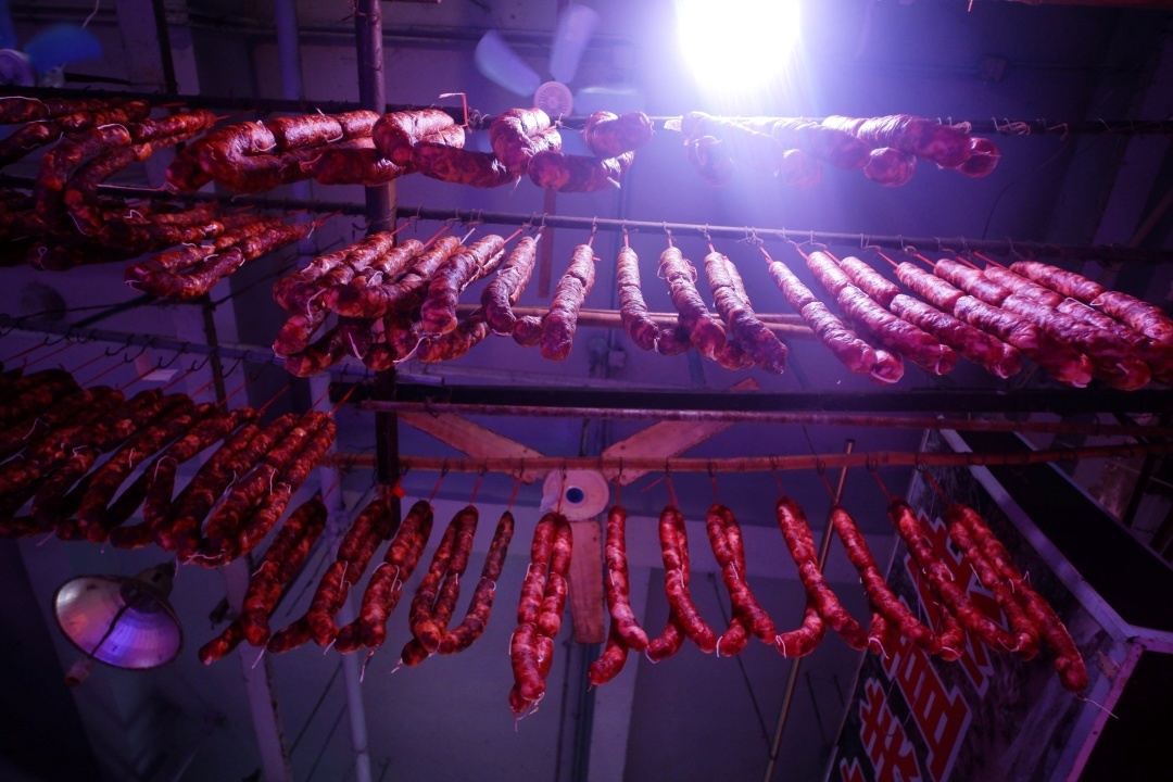 在安居天涯菜市场的过道上,商贩挂满了香肠。