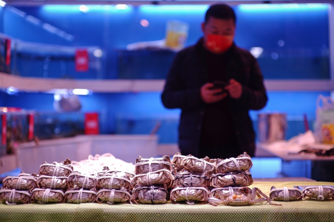 相较于综合性菜市场,青石桥市场商家受疫情影响更为直接。多位商家反映,疫情让不少消费者选择居家做饭,但“过了那股劲”,又回归往常。不同于一般时蔬、肉禽,海鲜品销售依赖于餐饮业。图中太湖大闸蟹专营店,卖家直言生意直线下滑,日销售额下降了60%-80%,每天多靠刷手机打发时间。