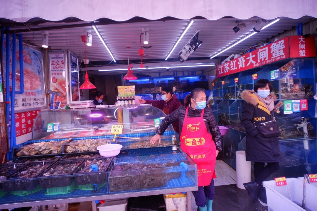 正是中午近12:00点,水产摊位前杨老板趴在桌子上午休。他告诉记者,水产品销售受疫情影响程度相对更大。“我们日常生意,一半通过零售,一半是餐馆订单,疫情一来,餐馆萧条,对我们自然影响大。”