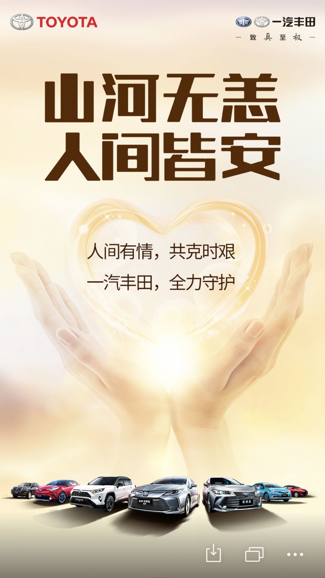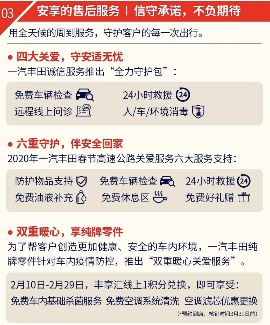 即日起至2020年3月31日,一汽丰田位车主推出“全力守护包”,提供免费车辆检查、24小时救援、远程线上问诊、人、车、环境消毒四大关爱。同时,2020年一汽丰田高速公路关爱服务提供六大服务支持,包括:防护物品支持、免费车辆检查、24小时救援、免费油液补充、免费休息区、免费好礼赠。六重守护,温暖与行。