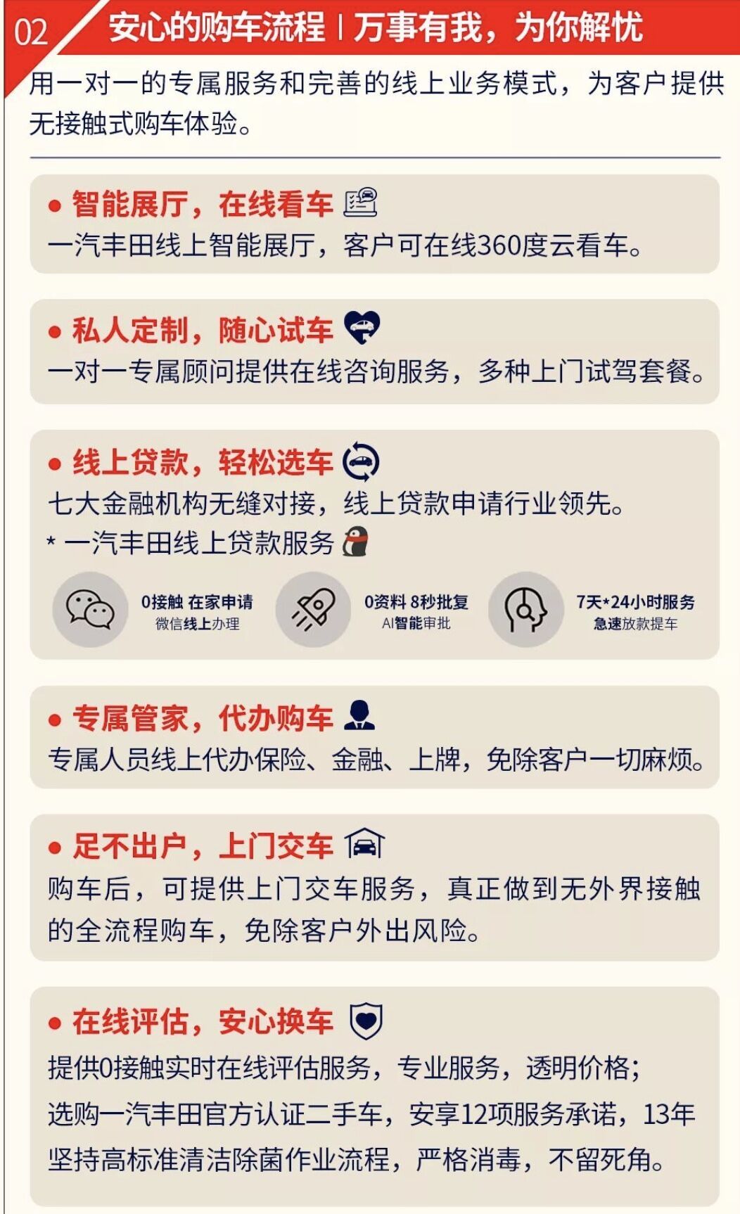 为线上下单的客户,提供上门交车服务,以及后续的保险、上牌手续的专人线上代办服务。其中,对于贷款购车的用户,提供线上贷款服务,在家申请0秒批复,极速放款提车。让客户真正做到无外界接触、享受私人订制的款待。为选购二手车的用户,一汽丰田安心二手车承诺,官方认证二手车拥有严格的汽车清洁消毒流程,真正做到“高标清洁 为爱护航”。