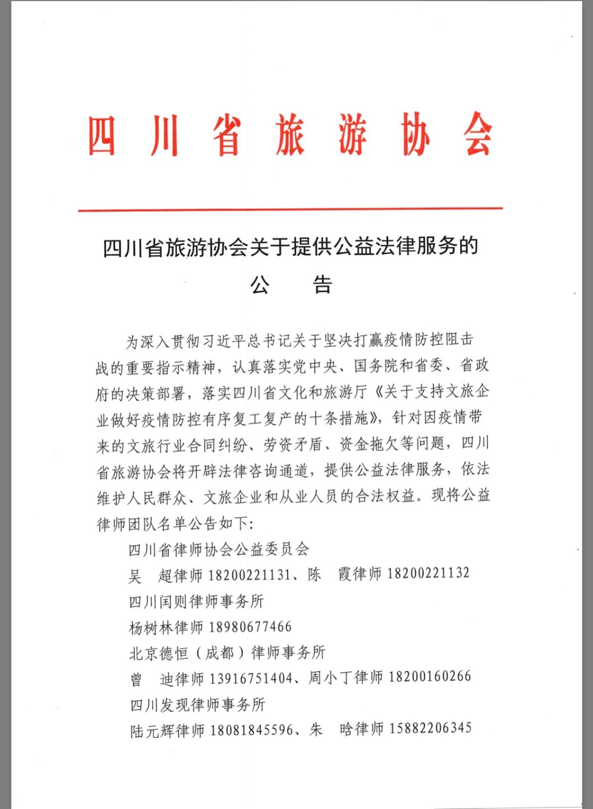 为帮助游客、旅行社等尽快解决好纠纷问题,2月19日,四川省旅游协会发布了关于提供公益法律服务的公告,开通法律咨询通道,推出公益法律服务。此服务针对因疫情带来的文旅行业合同纠纷、劳资矛盾、资金拖欠等问题,依法维护人民群众 、文旅企业和从业人员的合法权益。