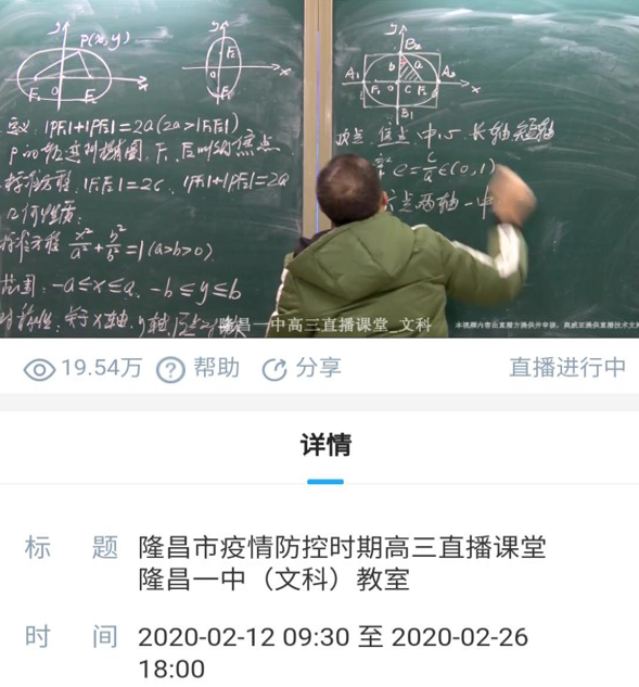面对延期开学,隆昌市分层分类推进网络授课教学,普通高中实行“一校一案”,投入40余万元采购直播设备4套,将线下课堂搬到线上,特别是为132名建档立卡高三贫困生提供免费学习流量,学生参与率100%。其他学段利用QQ、微信群等开展网上授课、录制视频、在线答疑、作业布置批改等,保障10万学子学习不间断、老师离校不离教、疫情防控不放松。