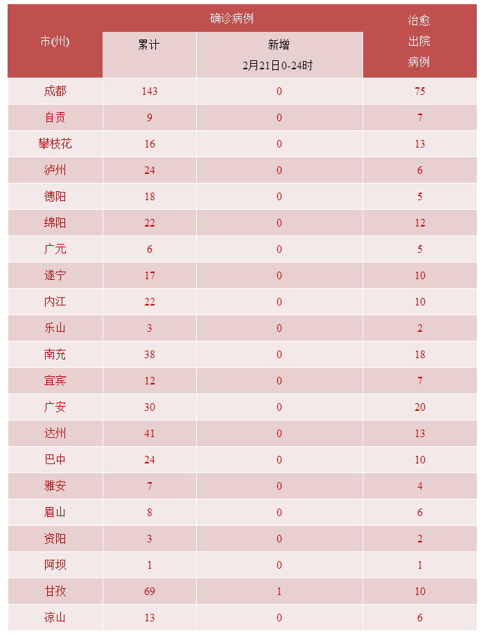 2月21日0-24时,我省新型冠状病毒肺炎新增确诊病例1例,新增治愈出院病例20例,新增疑似病例21例,无新增死亡病例。