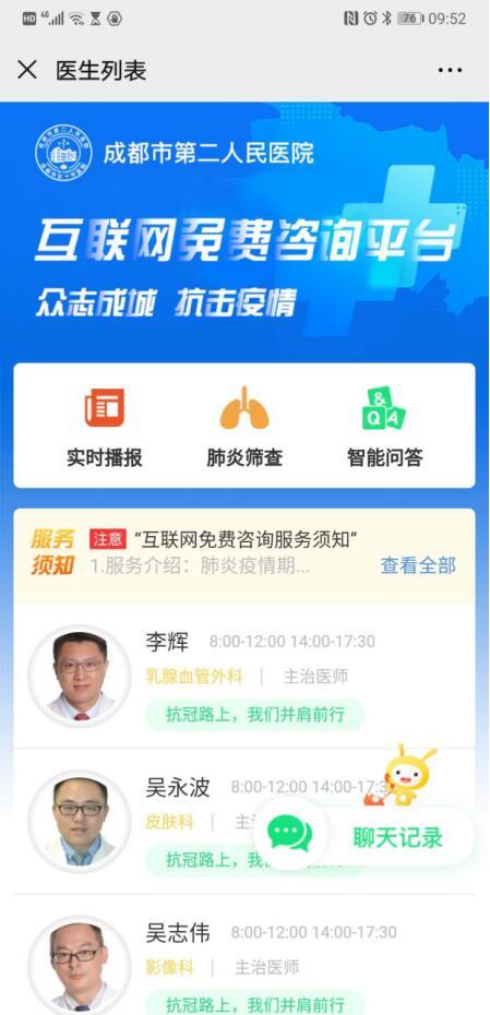 医院互联网诊疗咨询服务平台以医院官方微信公众号为载体,该平台除能够提供新型冠状病毒肺炎疫情的实时查询及相关资讯外,还涉及心理咨询、皮肤科、儿科、内分泌科、康复科、全科医疗科、肝胆外科、乳腺血管外科、妇产科、麻醉科、胸心外科、泌尿外科、康复科、影像科、检验科、超声影像科、临床药学、医疗保险办公室的18个专业,为市民提供线上心理疏导、健康评估、健康指导、健康宣教、就诊指导、用药指导、医保咨询等内容咨询,解决部分轻症病人线上问诊,引导重症病人线下就医,帮助市民解读相关医保政策。