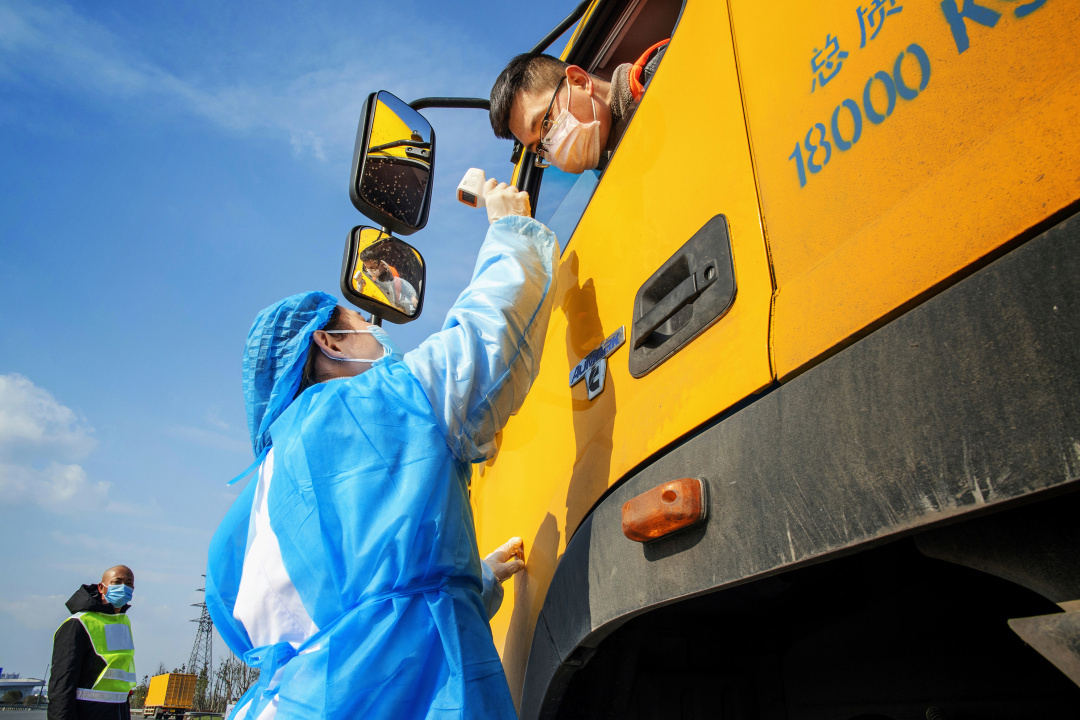 图片说明:2020年2月3日,成彭高速彭州收费站新冠肺炎疫情检测卡口,致和人民医院护士张芳正在为一辆重型入城卡车驾驶员量测体温。