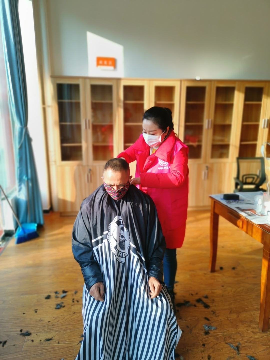 图片说明:钱堂红,40岁,成都市郫都区友爱镇顺安村七社村民,在友爱城镇上开了一家理发店,她人好,手艺不错,生意兴隆。疫情期间,她积极响应政府号召,暂停营业。后来看见村民都在说头发长了没地儿剪,她主动找到村委会,提出义务给村民理发。村委会打开了关闭的日间照料中心大门,提供场地,考虑到前来理发的人很多,商量后每天排30个人。就这样她已经连续理发4天了。她说,只要政府没开放理发店,她就一直免费给村民理发。