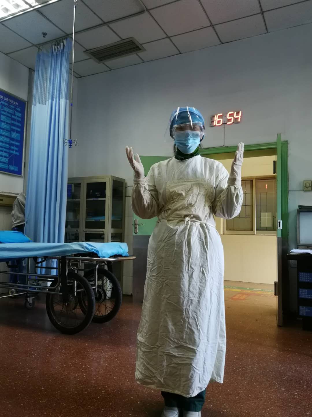 图片说明:攀钢集团总医院急诊科护士王春华自疫情发生后,每天出诊都要穿这厚厚的防护服,出诊后所有衣服都打湿了。图为王春华正准备出诊。