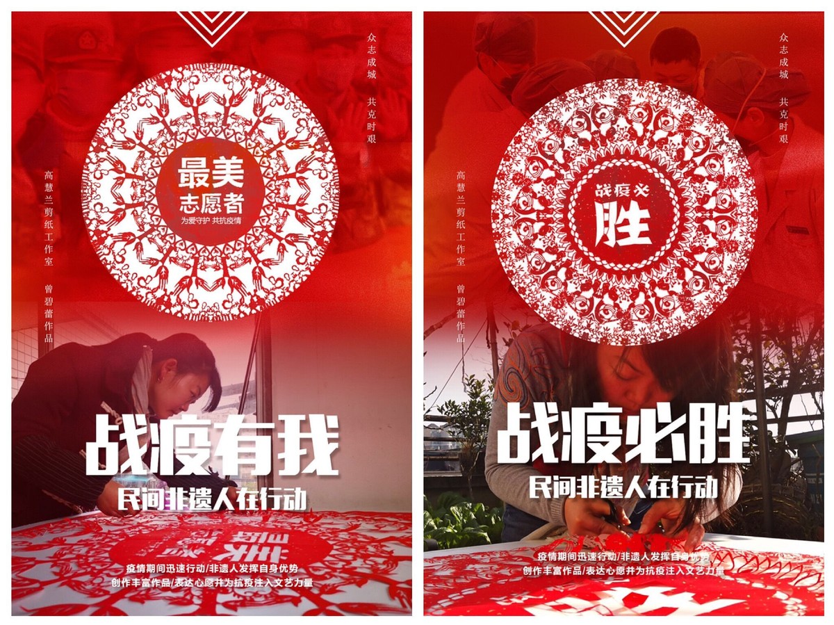 图片说明:在全民抗击新型冠状病毒肺炎疫情之际,高慧兰剪纸工作室的姐妹们积极投身到这场没有硝烟的特殊阻击战“疫”。她们用一双双巧手、一把把剪刀和一张张薄纸,创作了一幅幅精美的剪纸作品,用自己的艺术创作,表达抗击疫情、众志成城的心声,为打赢疫情防控阻击战作出自己的贡献。武汉加油!中国加油!