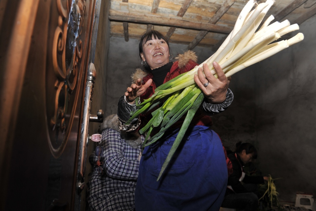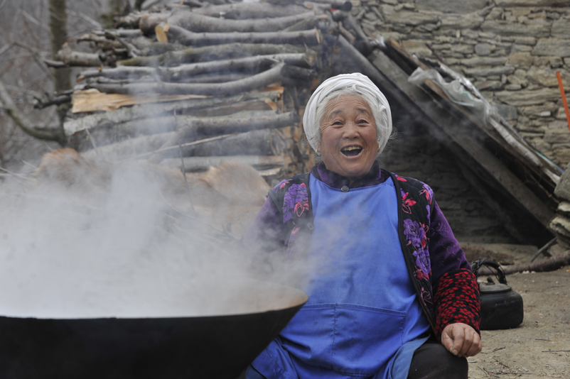 图片说明:汶川县羌寨,一位妇女在为大餐劳动。