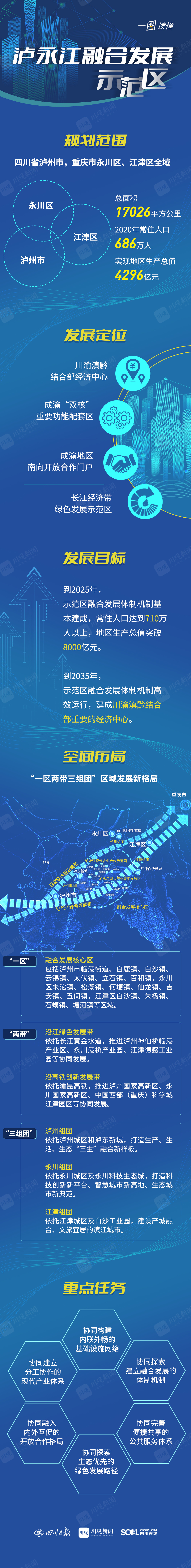 方案明确,泸永江融合发展示范区范围包括四川省泸州市,重庆市永川区、江津区全域。提出到2025年,示范区融合发展体制机制基本建成,常住人口达到710万人以上,地区生产总值突破8000亿元;到2035年,示范区融合发展体制机制高效运行,建成川渝滇黔结合部重要的经济中心。