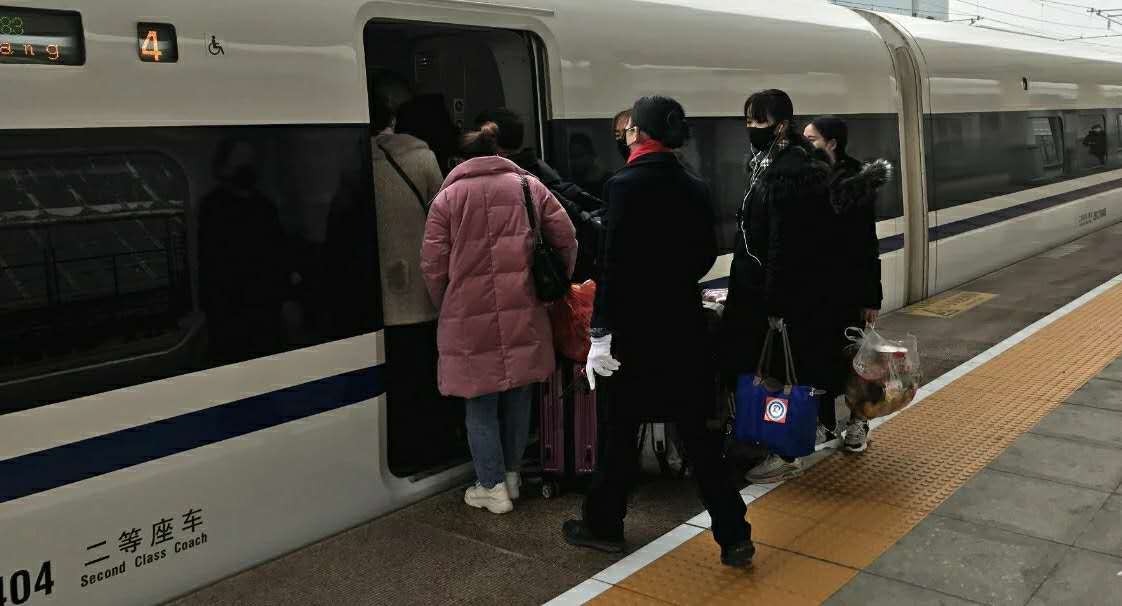 当天,来自内江各县(市、区)的外出务工人员来到成渝高铁内江北站,领取了统一乘车标识后,他们依次前往进站口测量体温、核实身份信息,并按照车厢号排列依次从检票口通过,到达指定位置候车。