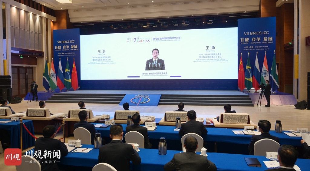 川观新闻综合消息 今年是金砖国家合作15周年,11月16日,第七届金砖国家国际竞争大会开幕式以线上方式举行,由国家市场监督管理总局、四川省人民政府联合承办,设北京、成都两个会场。国务委员、国务院反垄断委员会主任王勇在北京会场出席开幕式并致辞。四川省委书记彭清华在成都会场致辞。巴西经济防务行政理事会主席马塞多、俄罗斯联邦反垄断局局长沙思科利斯基、印度竞争委员会主席古普塔、南非竞争委员会主席博纳科勒在各自国家会场出席并致辞,最高人民法院常务副院长贺荣在北京会场致辞。国家市场监督管理总局局长、国务院反垄断委员会副主任张工主持开幕式,并介绍《金砖五国竞争机构负责人成都联合声明》有关情况。