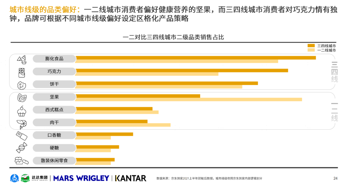 不同地区的消费者在产品选择和口味偏好上也大不相同,且具有明显的地域特色。一二线城市消费者偏好健康营养的坚果产品,三四线城市消费者则对巧克力情有独钟。