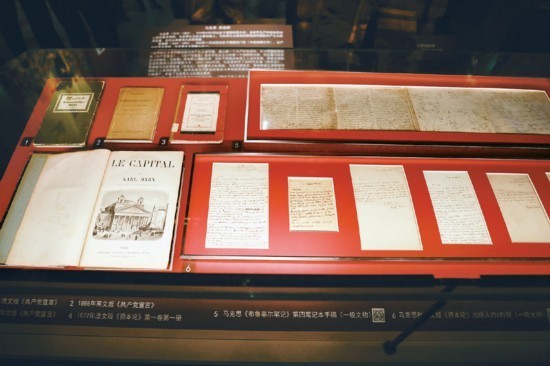 中国共产党历史展览馆的展厅里,陈列着多份珍贵的马克思手稿。右上为马克思《布鲁塞尔笔记》第四笔记本手稿;右下为马克思写给《资本论》法文版出版人的六封书信。 中新社发 陈晓根/摄