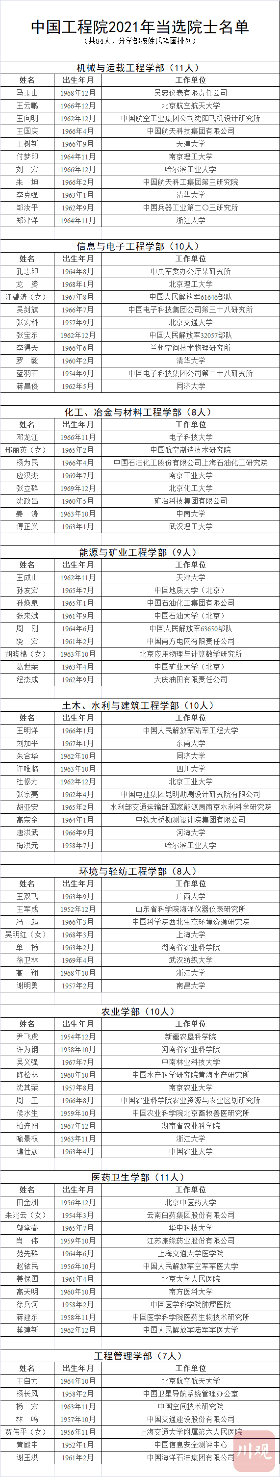根据《中国工程院院士增选工作实施办法》等规定,中国工程院2021年院士增选共选出中国工程院院士84人,其中女性科学家6人。在新当选中国工程院院士中,机械与运载工程学部11人,信息与电子工程学部10人,化工、冶金与材料工程学部8人,能源与矿业工程学部9人,土木、水利与建筑工程学部10人,环境与轻纺工程学部8人,农业学部10人,医药卫生学部11人,工程管理学部7人。新当选院士平均年龄58岁,最小年龄51岁,最大年龄69岁,60岁(含)以下的占75%。一批长期奋战在国家重大工程、核心技术攻关、坚守在东北老工业基地和西部边远地区的杰出工程科技专家当选。