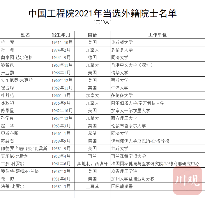 此外,2021年中国科学院新当选外籍院士25人,分别来自11个国家,韩国和瑞士首次有科学家当选中国科学院外籍院士;中国工程院新当选外籍院士20人。本次增选后,中国科学院院士总数为860人,外籍院士总数为129人;中国工程院院士总数为971人,外籍院士总数为111人。(总台央视记者 帅俊全)