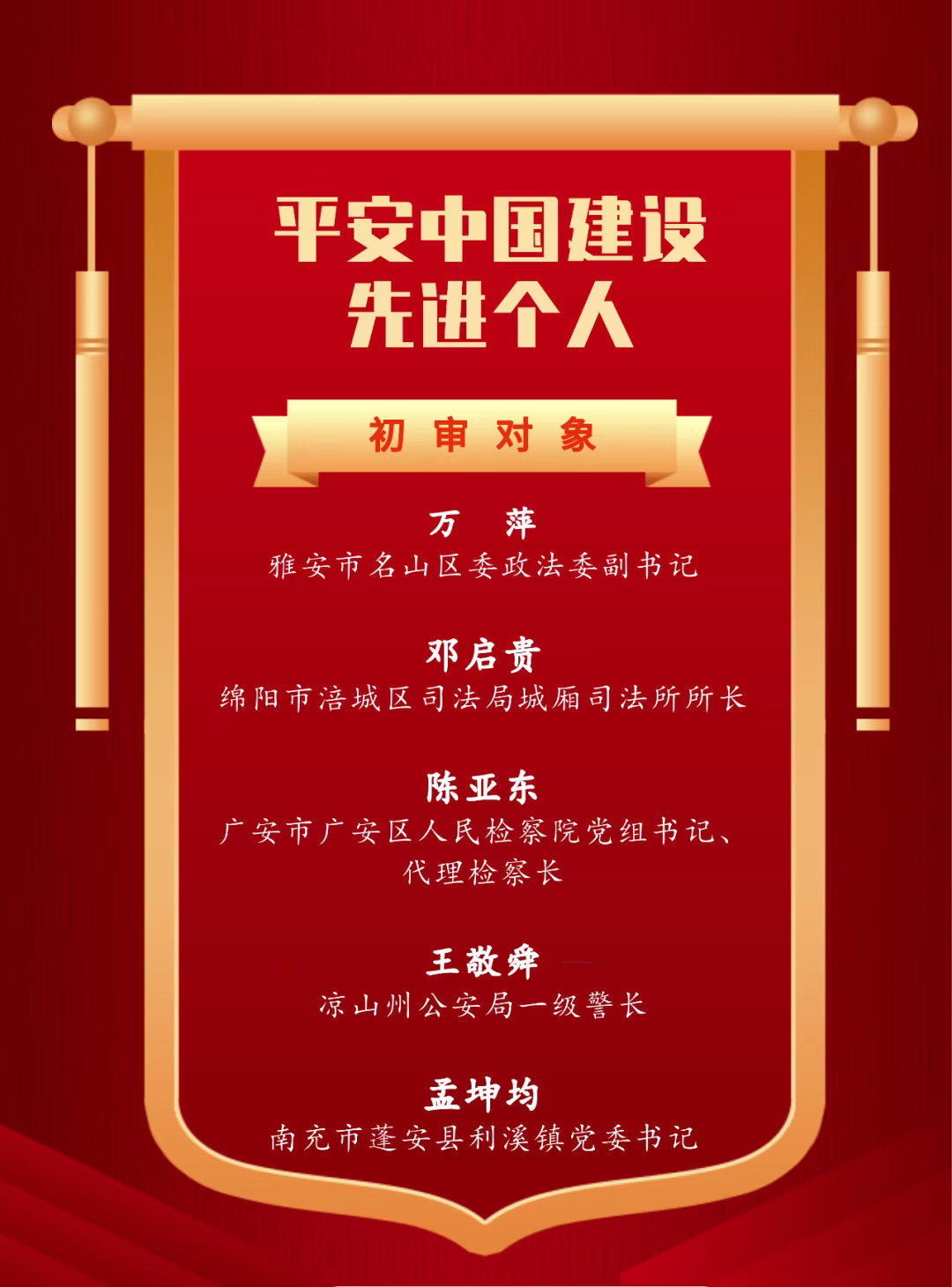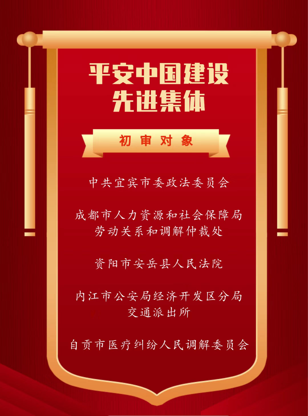 11月18日,四川省平安中国建设先进集体和先进个人评选推荐工作领导小组办公室对外公示了平安中国建设先进集体和先进个人初审对象,我省5个先进集体、5名先进个人经平安中国建设先进集体和先进个人评选表彰工作领导小组初审通过,进入公示名单,公示日期为2021年11月18日—11月24日。