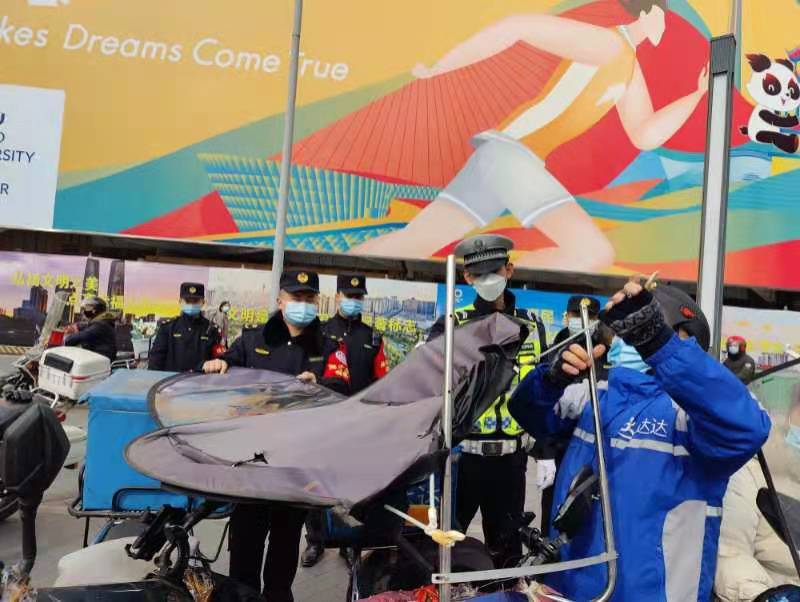 整治在东大街与红星路三段交叉路口进行,从该路口经过的电动自行车非常多,有不少驾驶人的车上都安有加装棚。一名驾驶员被交警拦下后,一开始并未意识到自己的违法行为。民警对其进行了批评教育,并分析了安加装棚的危害。