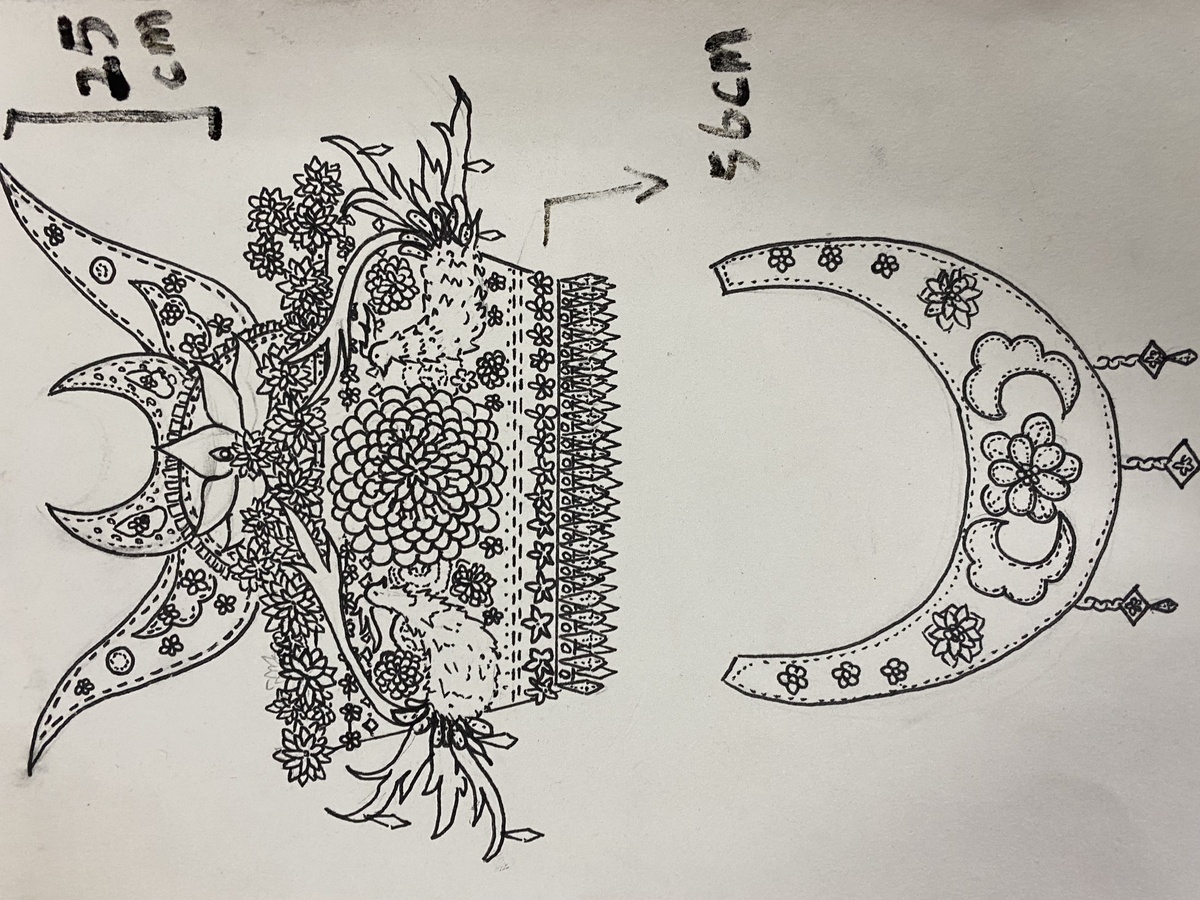 “搜集好材料后,我们7个人从10月18号开始了制作。”回忆制作过程时,丁综艺还指着遍布整件作品的装饰孔专门介绍:“这些装饰孔都是我们用缝被子的针,一个一个地敲出来。这个头饰边上的小挂件也不简单,每一个都是手工弄出来,因为体积特别小然后棱角也多,每个人手上基本都被划伤割破过。”
