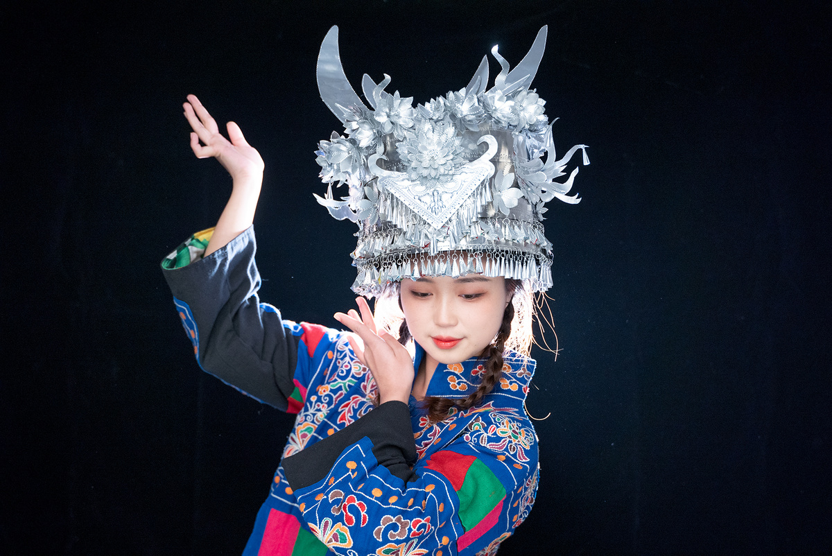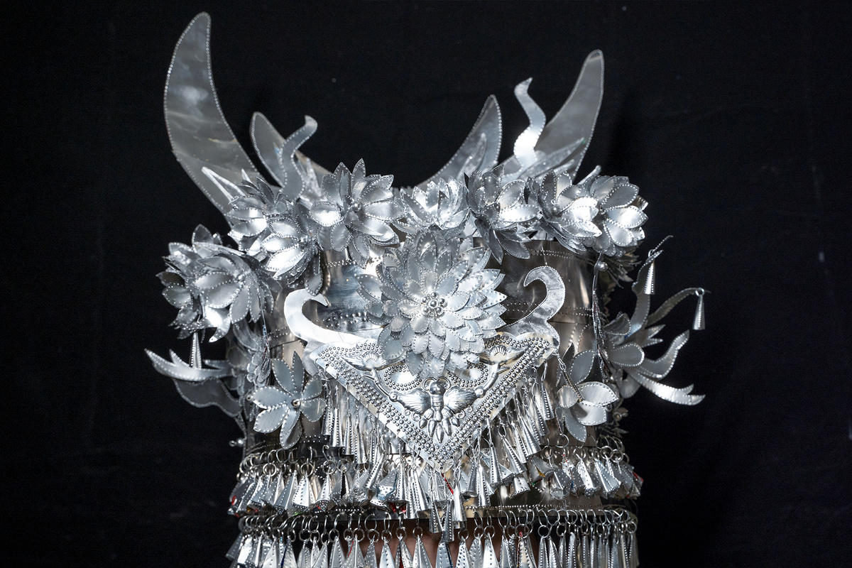 据了解,这件银色头饰是该系2017级6班丁综艺、尹芮、黄清婷等7位学生的毕业设计作品,这件作品由他们7人小组用85个易拉罐,耗时近20余天才制作完成。据尹芮介绍:“因为我本人就是少数民族,然后小时候也一直生活在云南,那时候就觉得苗族的服饰头饰特别好看,所以这次毕业设计就萌生了这个创意。”