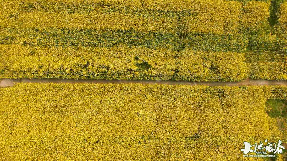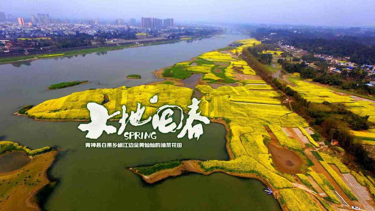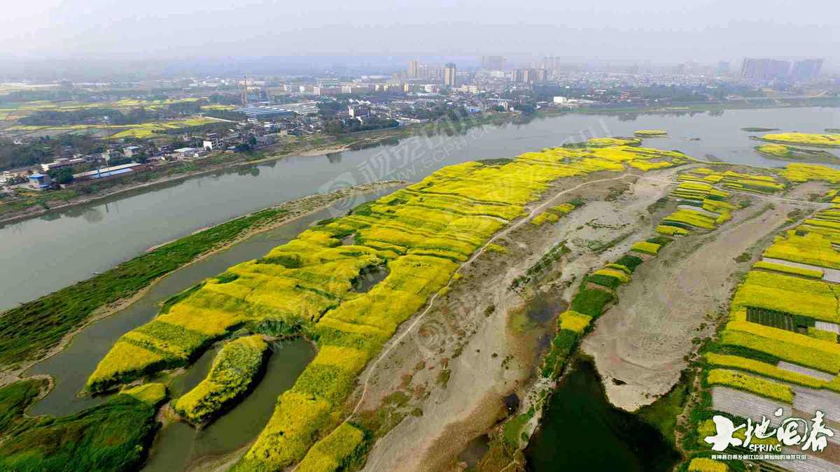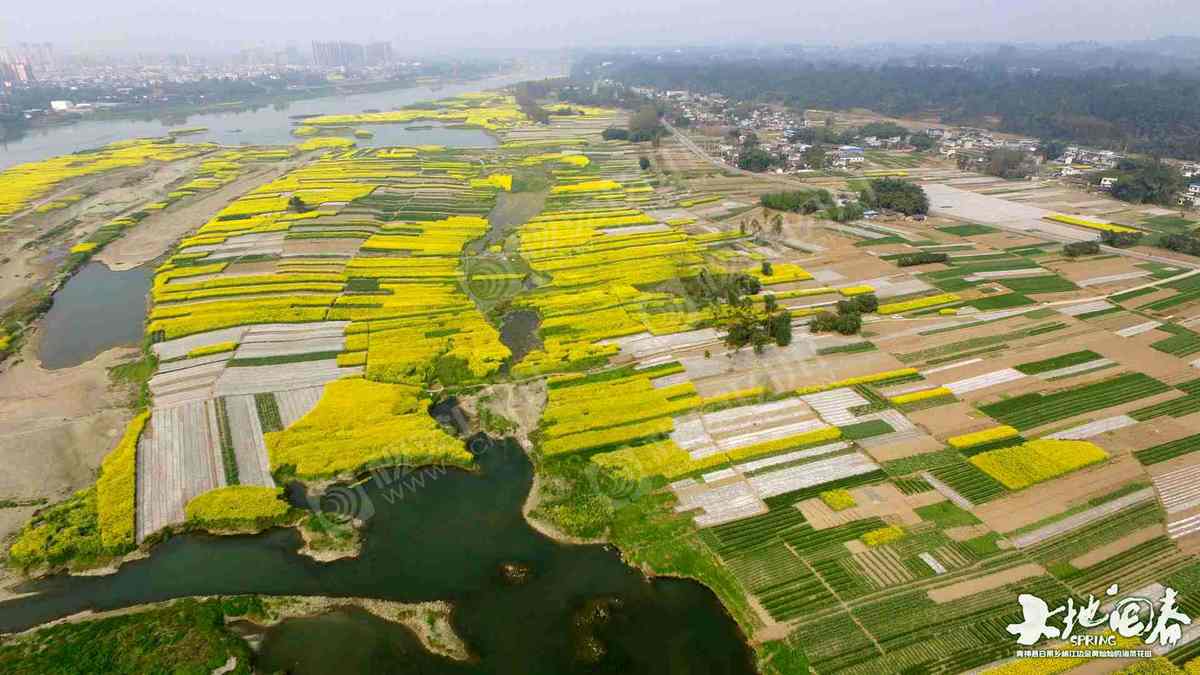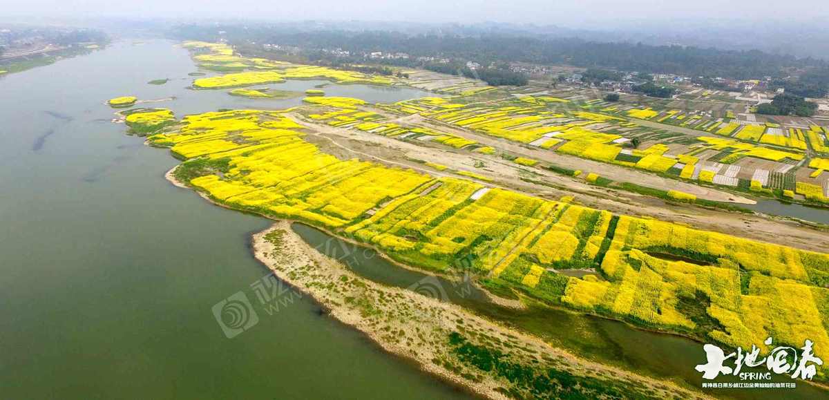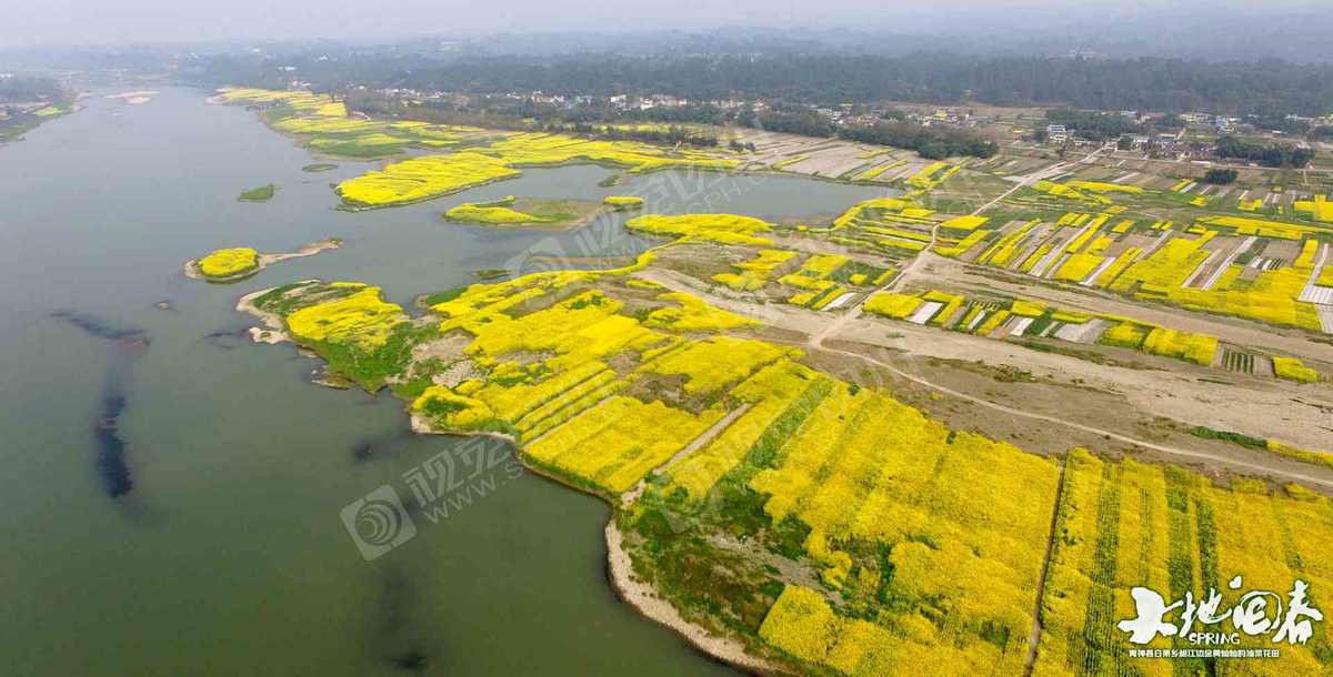 2020年2月26日,在四川省眉山市青神县白果乡岷江边航拍的金黄灿灿的油菜花田。农历“雨水”时节,成都平原气温回升,青神县田间地头的油菜花依次渐开,到处呈现出春意盎然生机勃勃的景象。
