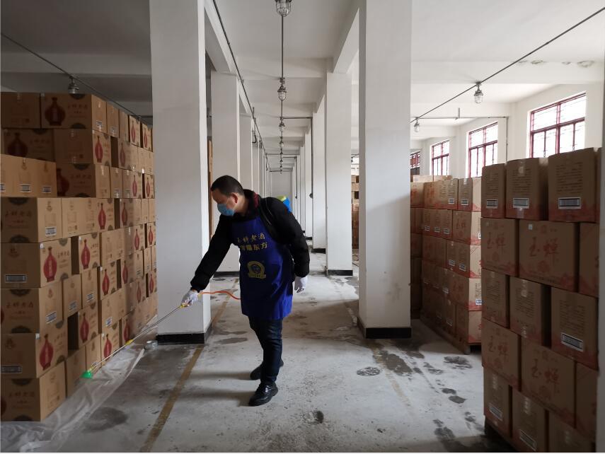 玉蝉老酒员工对包装车间进行消毒
