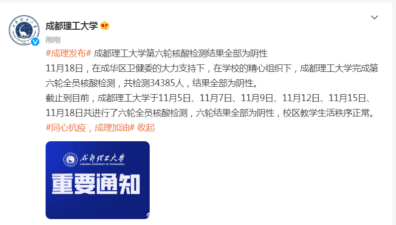 记者从成都理工大学获悉,11月18日,成都理工大学完成第六次全员核酸检测,结果全部为阴性。