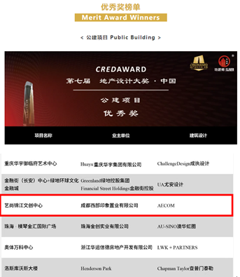 2020~2021第七届CREDAWARD地产设计大奖, 502家参赛机构共申报1919份作品,艺尚锦江项目是从中脱颖而出,荣获公建项目优秀奖。本项目方案由全球知名设计机构AECOM上海分公司设计,成都基准方中建筑设计有限公司进行施工图深化设计。