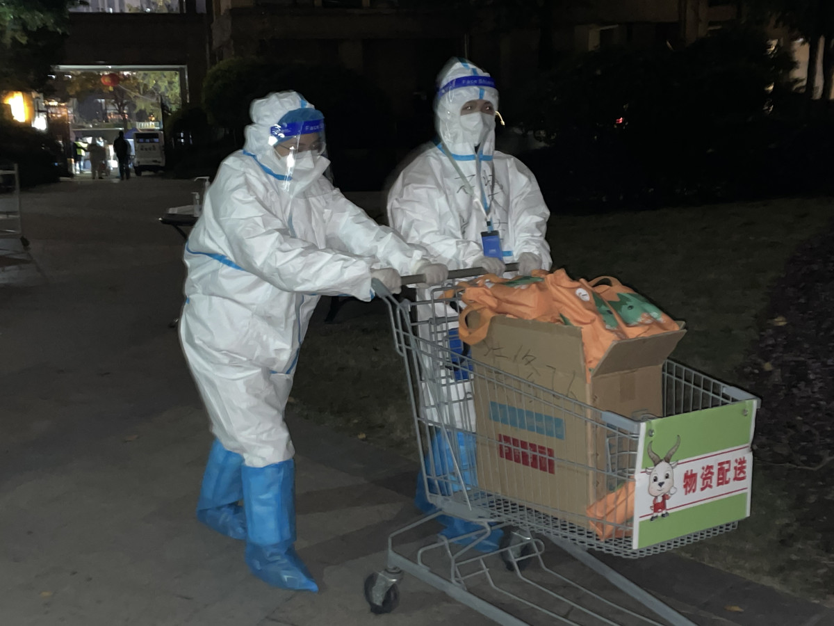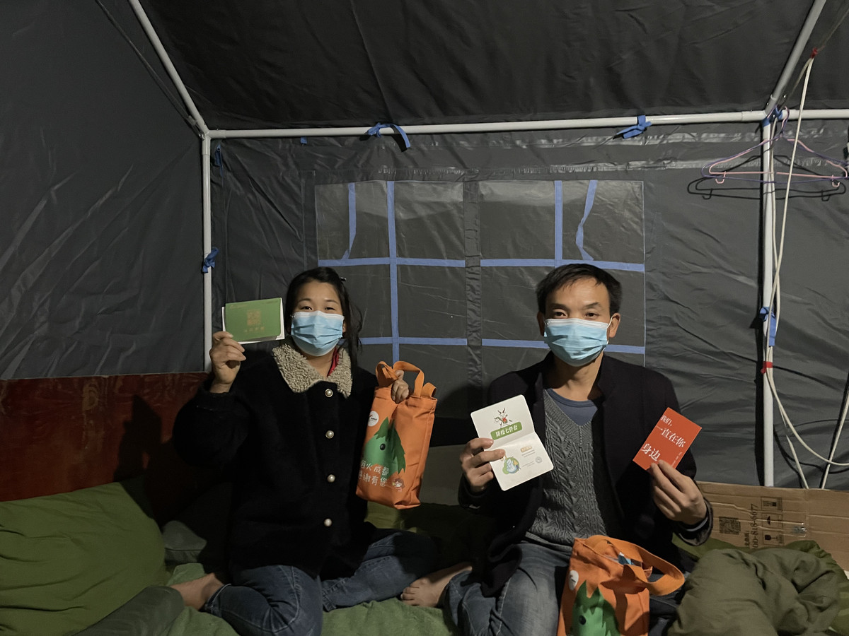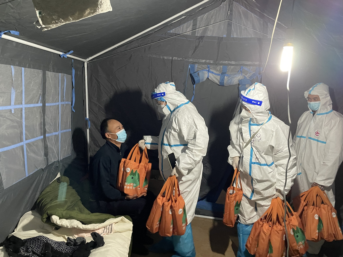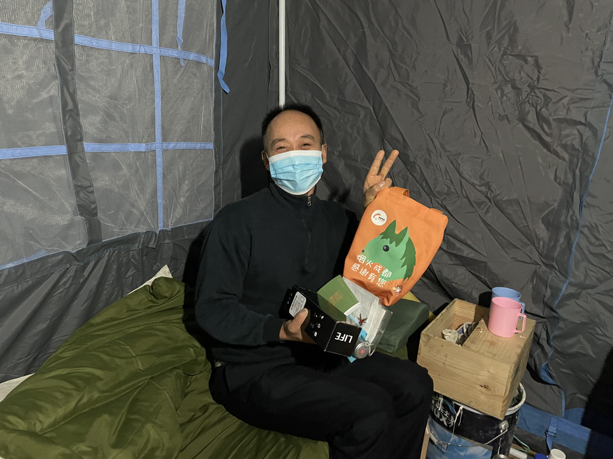 解封前15分钟,几位街道工作人员推着推车,转几个弯,来到保利百合花园小区一楼栋的架空层空地。这里,5个临时帐篷整齐排列,过去14天,因疫情被“困”的25名装修工人就住在这里。