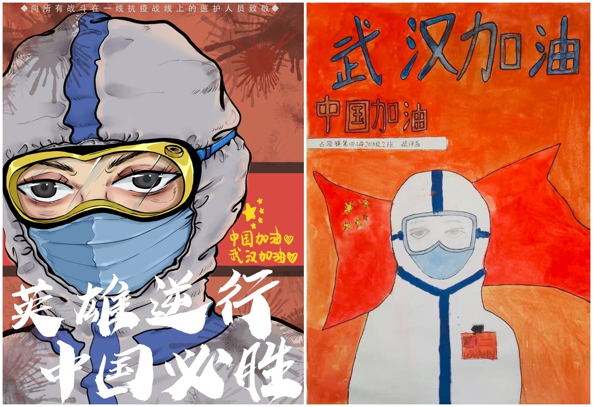 在此基础上,她改变了画面的排版,在不改变画面主要颜色的情况下,将医护人员画大,突出重点,细化防护服上的小细节,然后将小朋友画面中的国旗、主题以贴画和涂鸦的形式,画在了背景。在画面中添加了形似病毒的污渍,给人一种既危险又具有侵略性的气氛,烘托图中医护人员坚毅逆行的形象。
