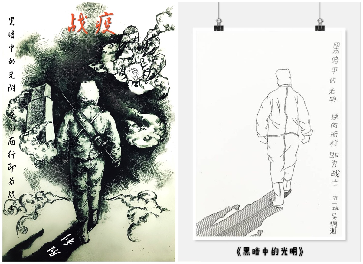 改造后的作品,将医护人员战士形象突出。将战士枪支的形象变成了针筒,体现了医护人员是靠医疗技术来抗衡这场战役;远处建筑的形象,让人联想到武汉硝烟滚滚体现出了这场战役的艰巨性以及残酷性;阴影的应用,不仅强化了医护人员的形象,更与后面的黑色元素形成呼应。