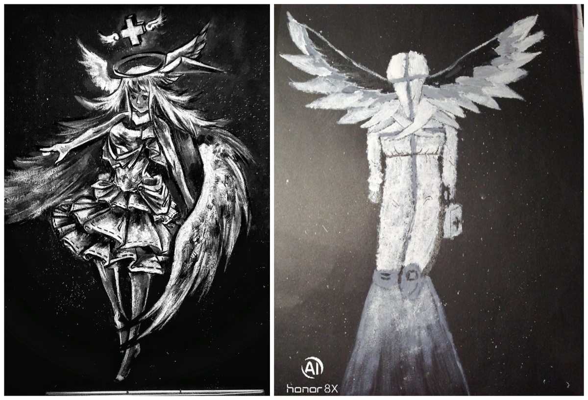 这是王雨珩的第三幅改造作品。初见小朋友的作品时,她觉得这幅最美的天使画地非常巧妙!用黑色做背景星空,用白色绘制人物,黑白的强烈对比给人强烈视觉冲击。
