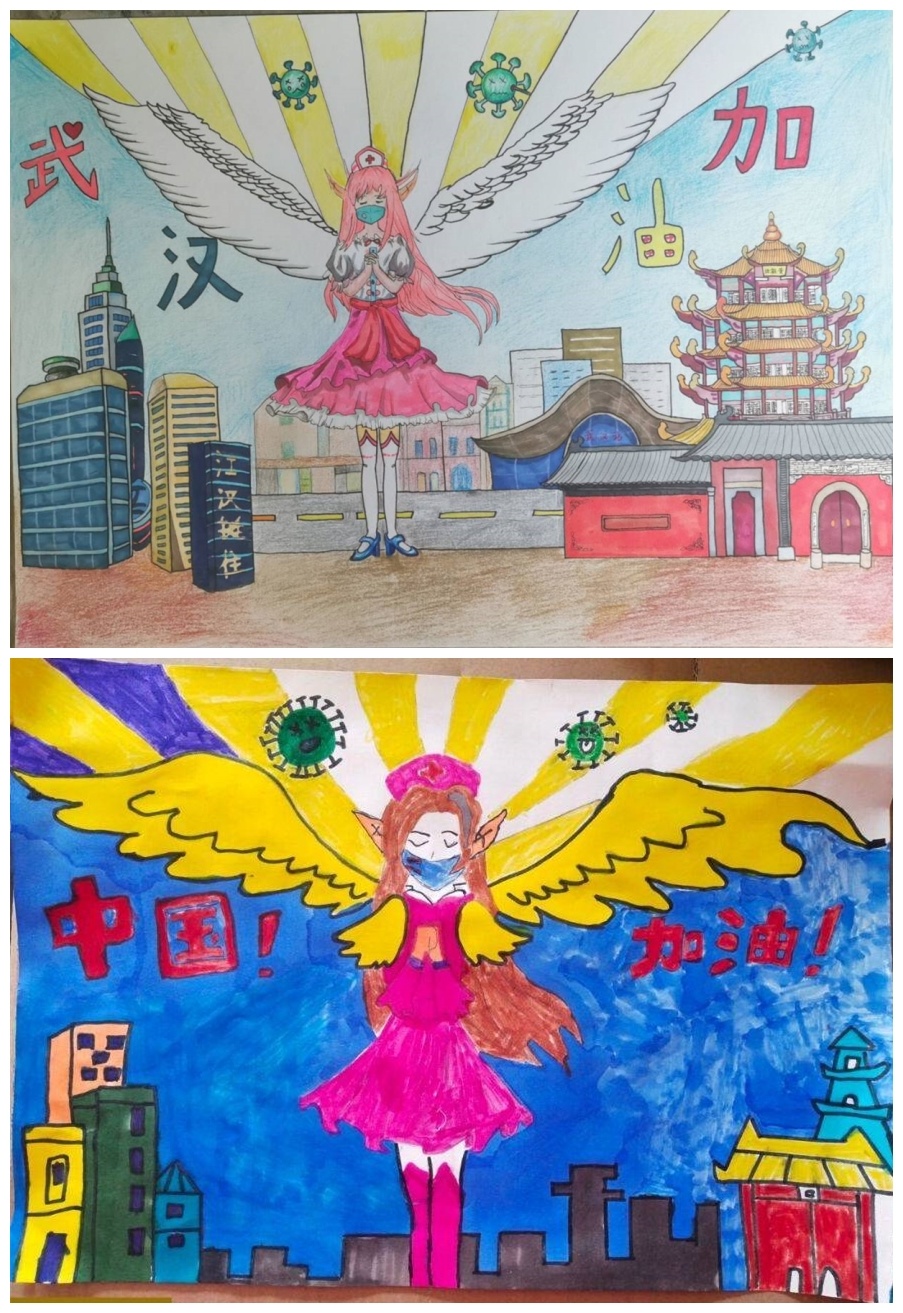 构图上与小朋友的作品保持的一致,很好的保持了小朋友的构图,在细节处理上丰富了很多。建筑物之间的节奏也处理得更加合适。是尤其是武汉的标志性建筑,进行了重点刻画,非常有看点。人物形象的比例优美度,手上的祈福姿势都强化了主题。点线面之间的丰富度都进行了新的调整。