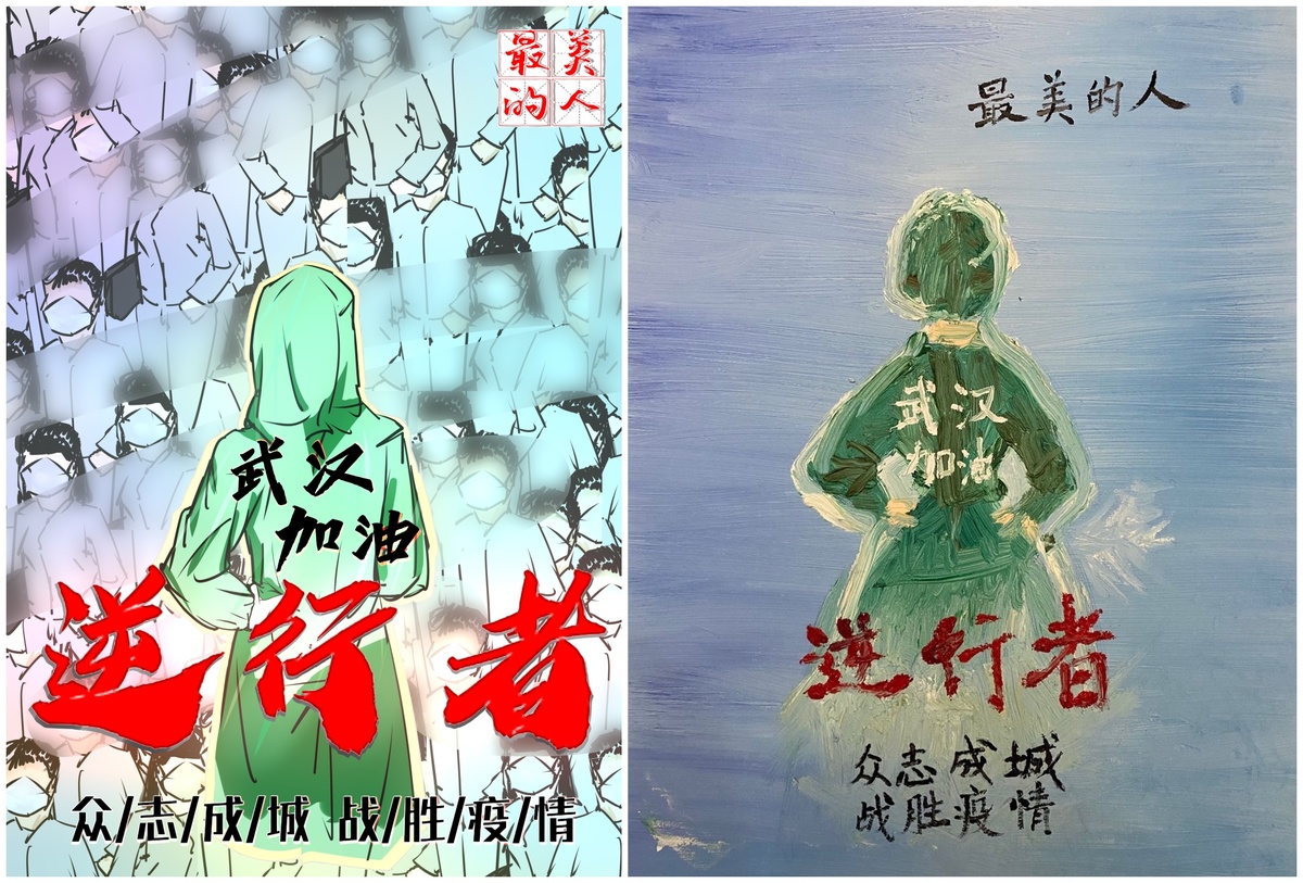 改造作品主题人物形象突出,配色统一,又有丰富变化,视觉张力强,弥补了原作的缺憾。虚实变化的处理也非常好,医护人员正面形象得以强化,病毒的虚化处理体现了人们必定能战胜这场战役。