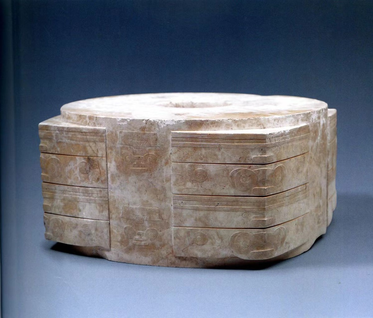 同时,良渚玉琮的表面存在分节,其中,反山12号墓出土的玉琮王更是达到了10节。与从表面,饰以极具良渚特色的神人兽面纹纹饰。方向明表示,神人兽面纹在良渚玉琮上基本上是程式化的图案,虽然存在或繁或简的形态差别,但所有的玉琮上都能看见。“而到了金沙,与从表面就只剩下几条简单的网格线了,三星堆更是出土了素面玉琮。”
