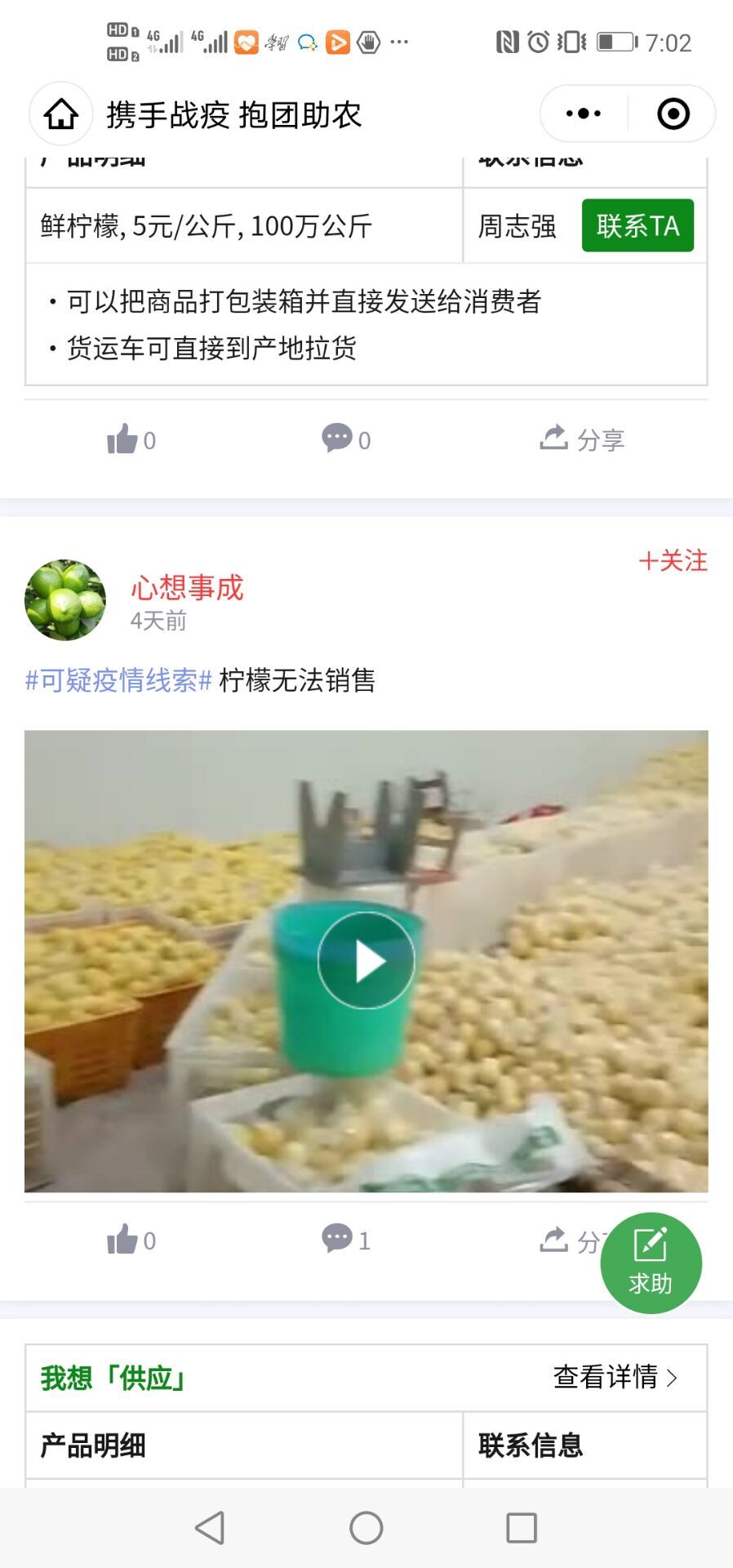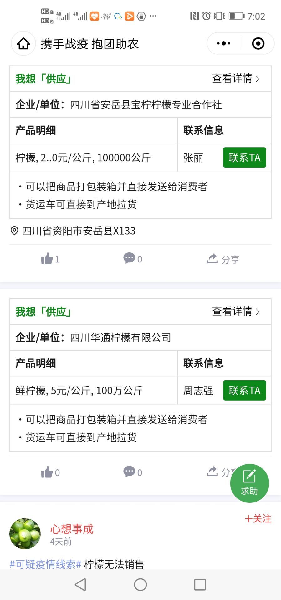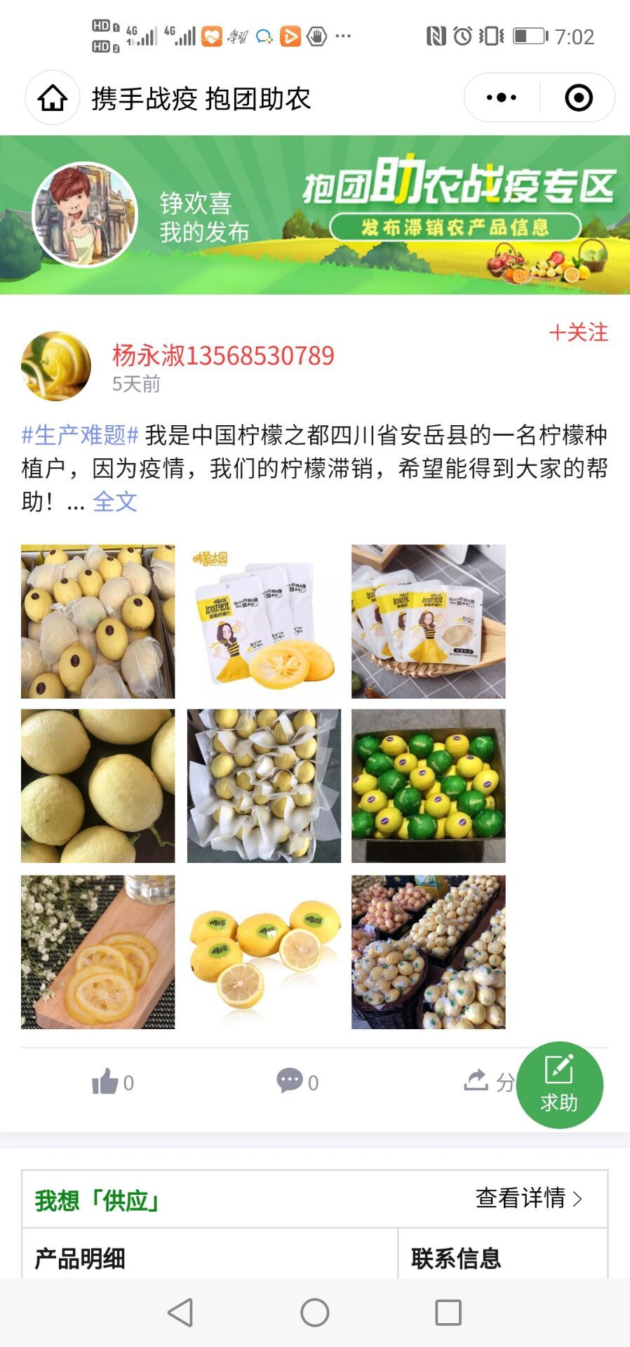 “现有库存柠檬一、二、三级果三十多万斤。销售价1.5元每市斤。”近日,资阳市安岳县花香园柠檬专业合作社也通过“抱团助农战疫”平台求助,信息虽简单但却直接抛出了价格,报价之低令人心动。